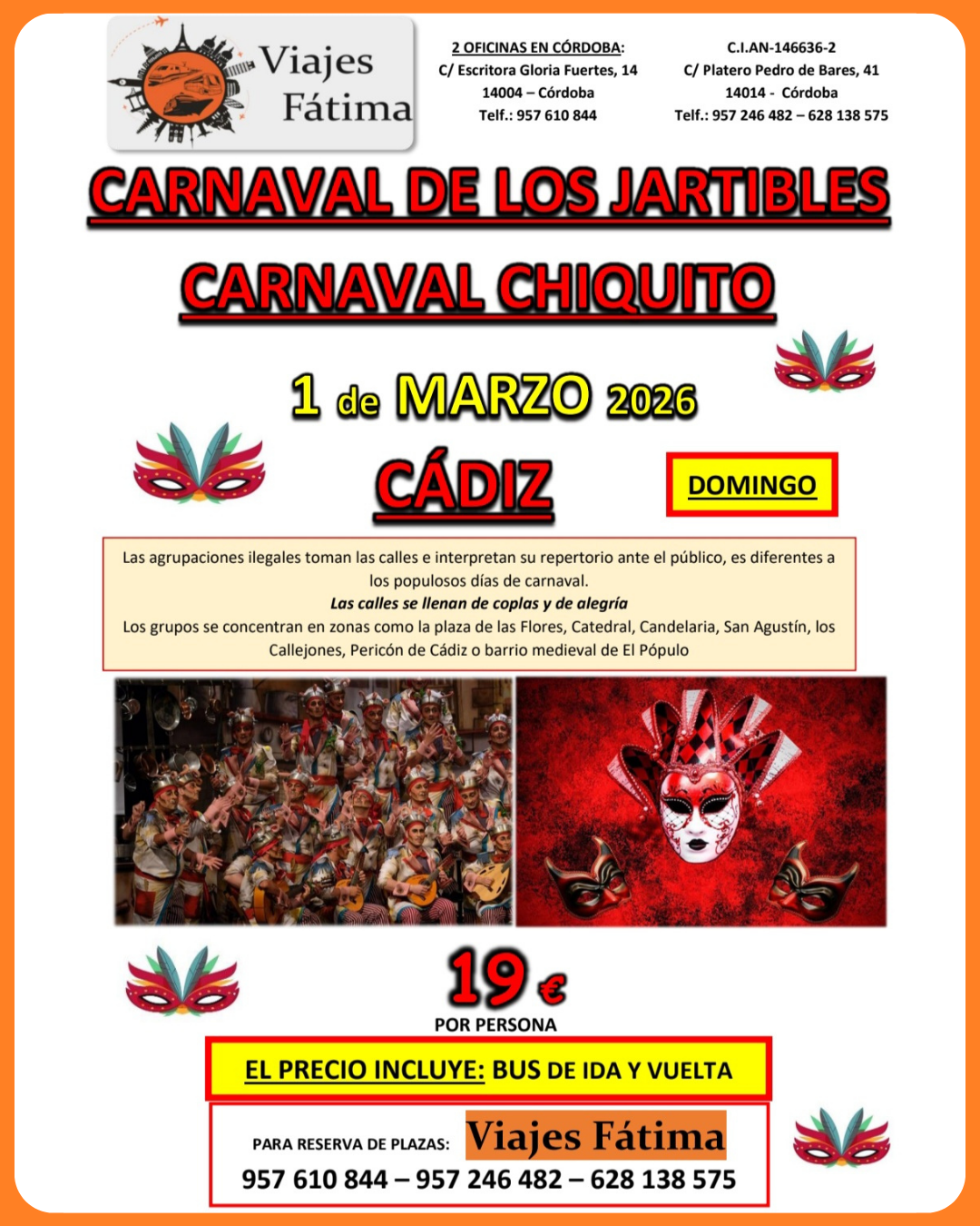 Si buscas una escapada de un día con buen ambiente, tradición y mucha calle, este viaje a Cádiz para el Carnaval de los Jartibles es una apuesta segura: vas, disfrutas a tu ritmo y vuelves con la sensación de haber vivido un carnaval auténtico.