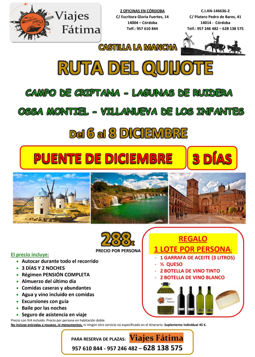 Por solo 288€ por persona, la Ruta del Quijote de Viajes Fátima es una opción ideal para parejas, grupos de amigos, asociaciones y viajeros que buscan un viaje cultural desde Córdoba diferente, cómodo y bien organizado durante el Puente de la Constitución. Como detalle especial, cada viajero recibirá un lote de productos típicos con aceite, queso y vino. Plazas limitadas.
