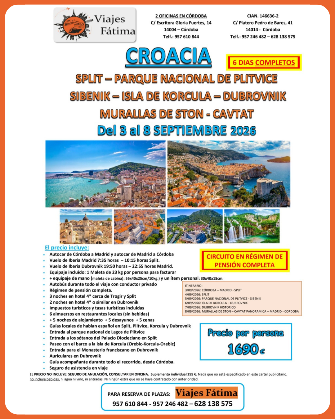 - Recorrido: Split – Plitvice – Sibenik – Korcula – Dubrovnik – Ston – Cavtat