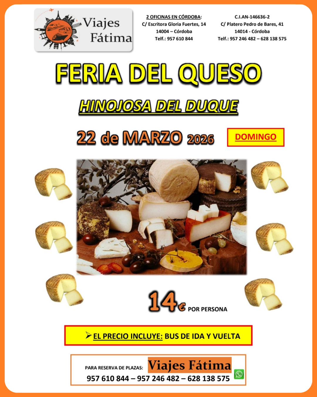 Si buscas una salida cómoda, sin preocuparte por el coche, aparcar o la carretera, este viaje a la Feria del Queso en Hinojosa del Duque es una opción muy práctica. Ideal para amantes del queso, para quienes disfrutan de escapadas gastronómicas, o para grupos de amigos y familias que quieren pasar el día fuera. Además, Hinojosa del Duque es un destino con encanto, perfecto para combinar la visita a la feria con un paseo por el pueblo y una jornada completa de desconexión.