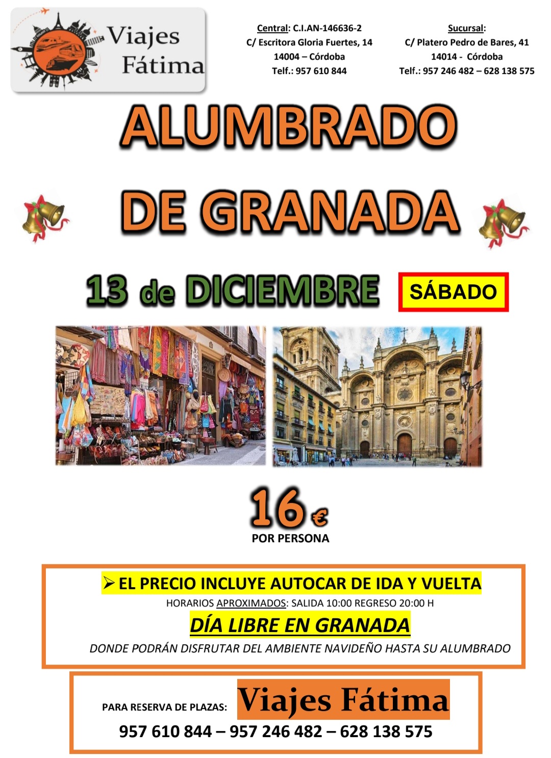 Viajes Fátima, agencia de viajes en Córdoba, te propone una escapada sencilla y económica para vivir el alumbrado navideño de Granada el sábado 13 de diciembre. Un plan perfecto de un día para pasear por su centro histórico, adelantar compras, tapear y disfrutar del ambiente festivo cuando se encienden las luces. El paquete incluye autocar de ida y vuelta con salida por la mañana y regreso por la noche (horarios aproximados 10:00–20:00), a un precio imbatible de 16€ por persona.