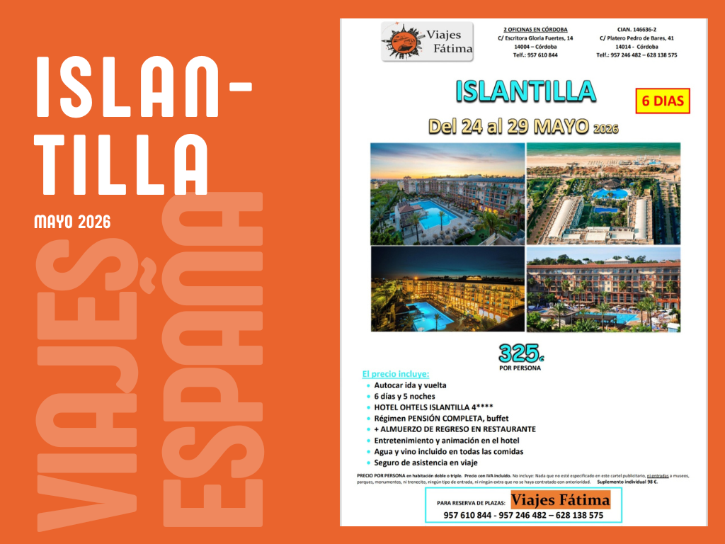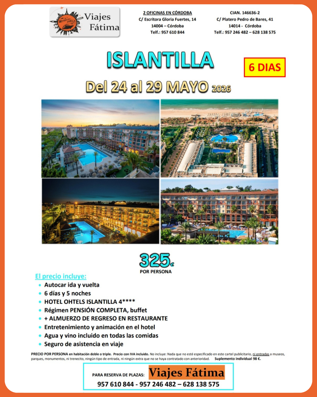 Si te apetece una escapada de costa con calma, buen hotel y todo organizado, este viaje a Islantilla es un plan perfecto para desconectar antes del verano. Del 24 al 29 de mayo de 2026 disfrutarás de 6 días / 5 noches en una de las zonas de playa más cómodas de Huelva, con un enfoque 100% relax: hotel 4★, pensión completa buffet, animación y entretenimiento, y la tranquilidad de viajar en autocar ida y vuelta desde Córdoba.