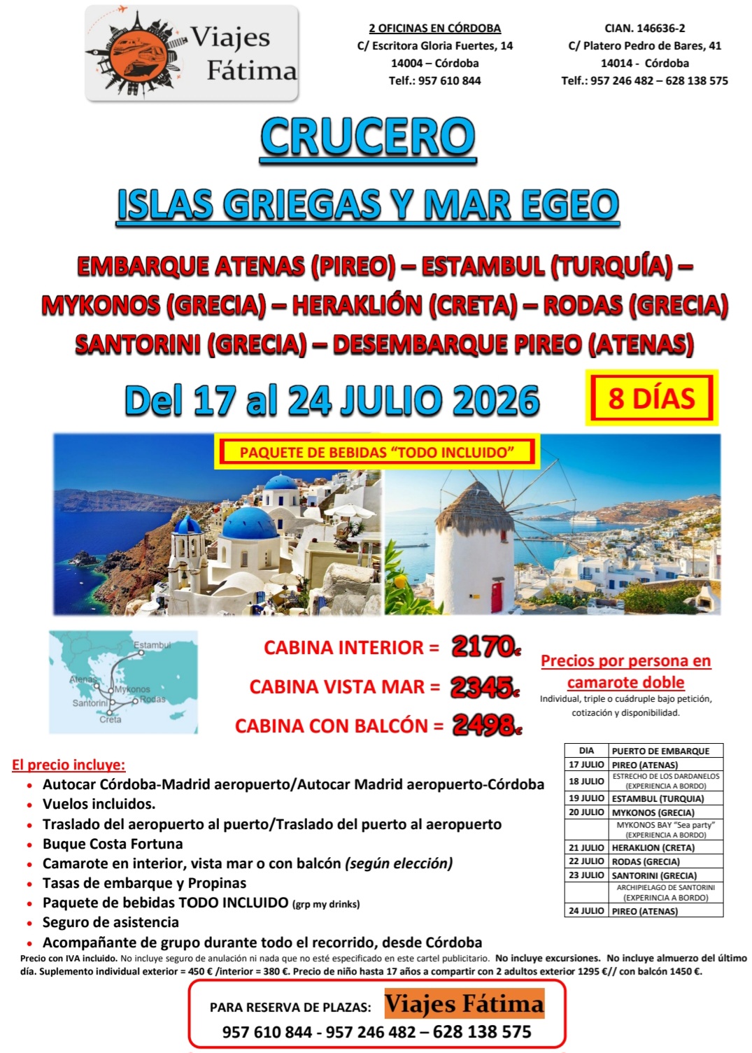Durante la travesía disfrutarás también de momentos especiales a bordo, como el paso por el Estrecho de los Dardanelos, la experiencia en Mykonos Bay “Sea party” y la navegación por el Archipiélago de Santorini, todo con la comodidad de un viaje organizado desde Córdoba y con la tranquilidad de tener traslados, vuelos y asistencia incluidos. Si buscas un crucero en julio 2026 con ruta completa, buen barco y destinos top, este es el plan.