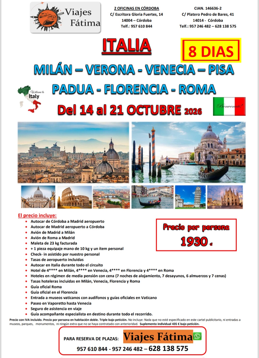 Circuito por Italia de 8 días con salida desde Córdoba, ideal para descubrir los grandes clásicos sin preocuparte por traslados, hoteles ni reservas. Del 14 al 21 de octubre de 2026 recorrerás Milán, Verona, Venecia, Pisa, Padua, Florencia y Roma, combinando patrimonio, cultura y rincones de postal. Un viaje perfecto para amantes del arte y la historia, y también para quien quiere “ver mucho” en pocos días con organización profesional.