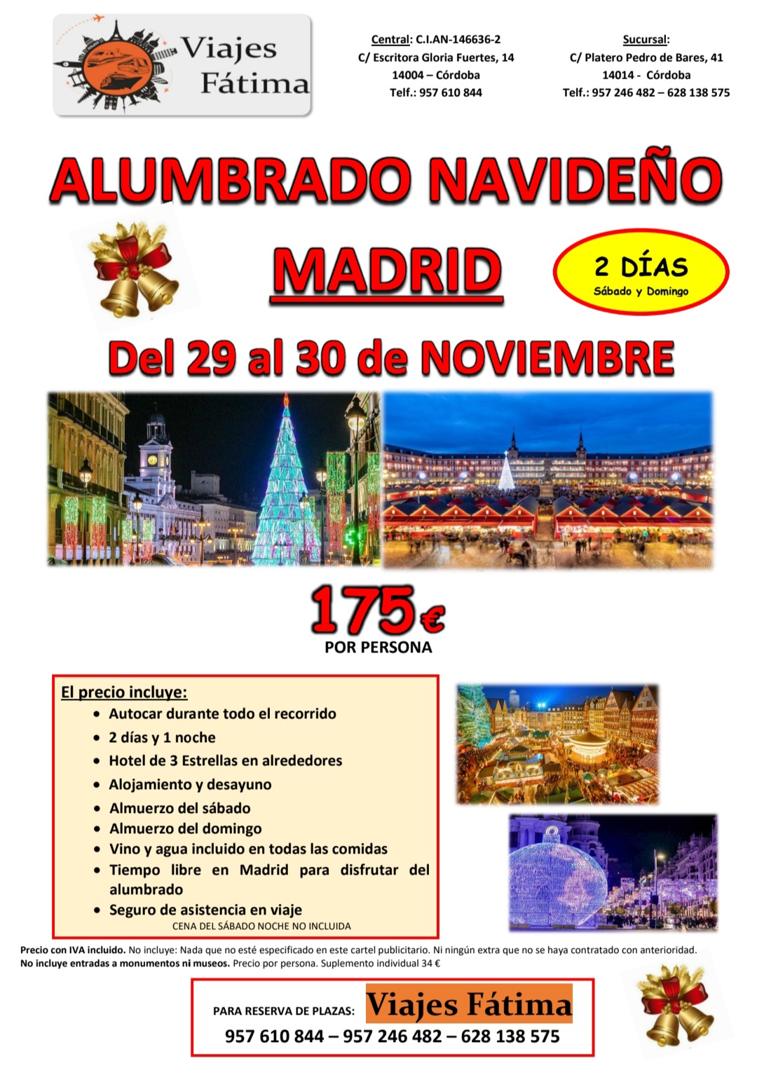 Por solo 175€ por persona, Viajes Fátima organiza todo el recorrido en autocar, coordinación del grupo y acompañamiento, para que solo tengas que preocuparte de disfrutar. Una opción perfecta para parejas, familias, grupos de amigos o asociaciones que buscan una excursión a Madrid desde Córdoba cómoda, segura y económica antes del puente de diciembre. Plazas limitadas.
