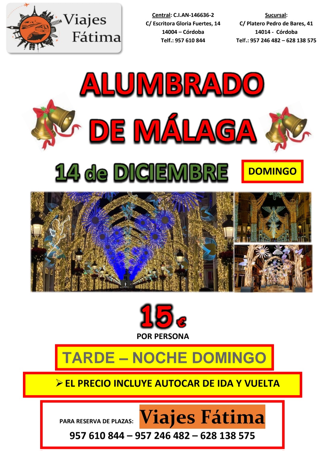Viajes Fátima, agencia de viajes en Córdoba, te invita a una escapada exprés para vivir el Alumbrado de Málaga el domingo 14 de diciembre. Es el plan perfecto para ver el encendido en su mejor momento, tarde–noche, sin preocuparte por coche, peajes ni aparcamiento. Por solo 15€ por persona disfrutarás de autocar de ida y vuelta y tiempo libre para recorrer el corazón de Málaga a tu aire.