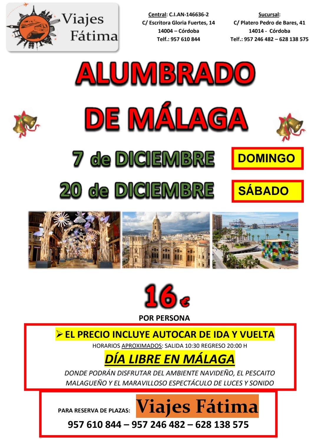 Viajes Fátima, agencia de viajes en Córdoba, te lleva a vivir el alumbrado de Málaga con una excursión cómoda, económica y sin complicaciones. Elige tu fecha: domingo 7 de diciembre o sábado 20 de diciembre. Por solo 16€ por persona disfrutarás de autocar de ida y vuelta para pasar un día libre en Málaga y presenciar el famoso espectáculo de luces y sonido de la Calle Larios, uno de los encendidos navideños más reconocidos de Europa.
