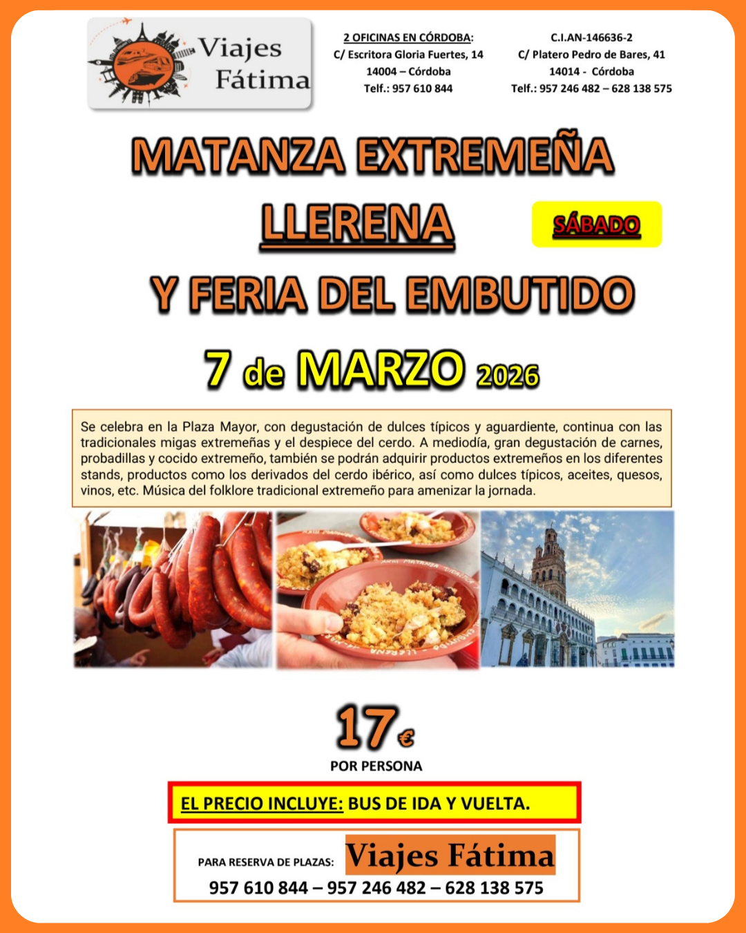 Si te apetece un plan auténtico, con sabor a tradición y ambiente de pueblo, esta excursión a Llerena (Extremadura) es para ti. Vive en primera persona la Matanza Extremeña y la Feria del Embutido, una jornada popular que reúne gastronomía, folklore y productos de la tierra en un entorno lleno de vida. Es el tipo de viaje perfecto para quienes disfrutan del tapeo, de los mercados locales y de la cultura gastronómica de toda la vida, sin prisas y con tiempo libre para recorrer el centro y dejarte llevar por el ambiente.