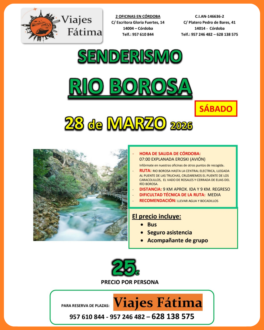 La ruta está pensada para disfrutar del paisaje paso a paso, sin prisas. Partimos desde Córdoba en autocar y, ya en destino, comenzamos el recorrido siguiendo el cauce del Borosa hasta la central eléctrica, pasando por puntos muy conocidos del itinerario: el Puente de las Truchas, el Puente de los Caracolillos, el Vado de Rosales y la espectacular Cerrada de Elías, uno de los tramos más llamativos por su estrechamiento del valle y la sensación de caminar literalmente pegado al río.