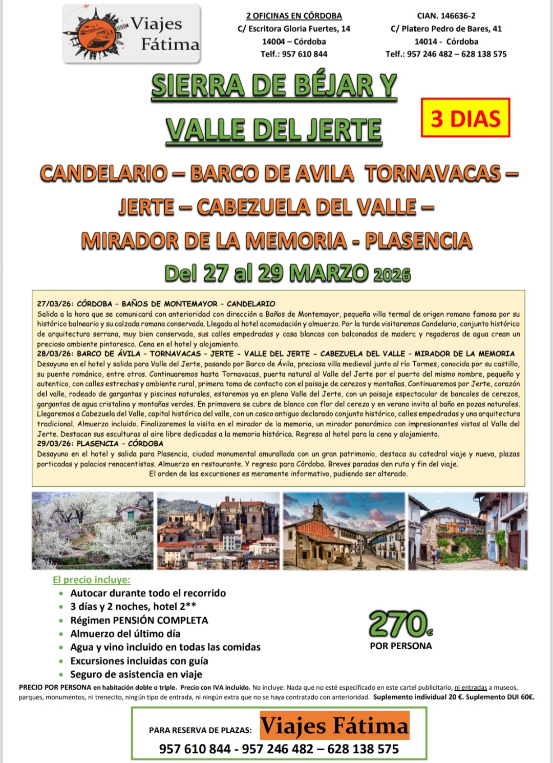 Vive una escapada de 3 días y 2 noches entre naturaleza, miradores y pueblos con historia. Salida desde Córdoba para descubrir la villa termal de Baños de Montemayor y el encanto serrano de Candelario. El segundo día recorremos el corazón del Valle del Jerte pasando por Barco de Ávila, Tornavacas, Jerte y Cabezuela del Valle, con parada en el Mirador de la Memoria. Cerramos con visita a Plasencia antes del regreso.