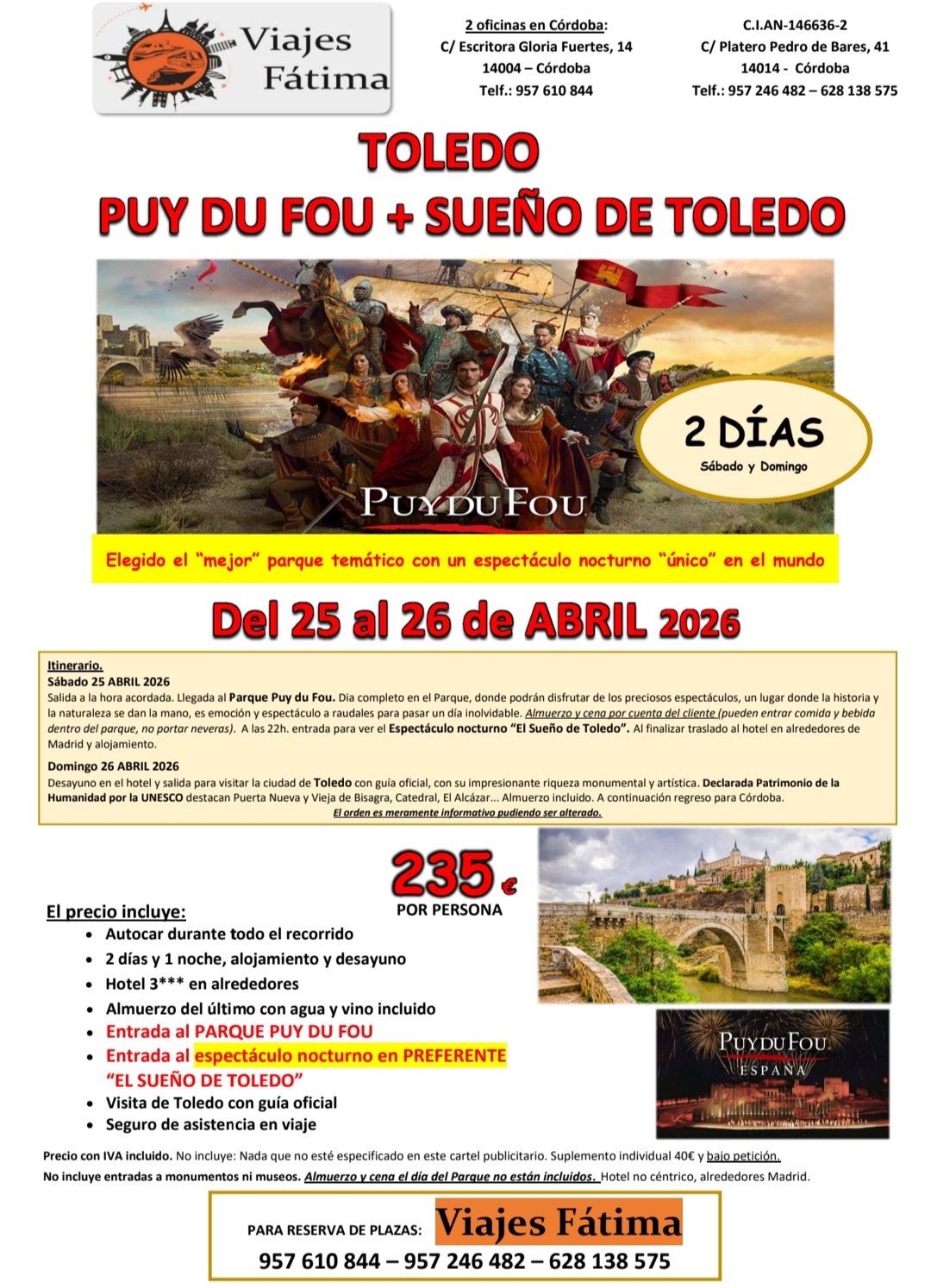 Si te apetece un fin de semana diferente, este viaje a Toledo es un plan redondo: combina la emoción de Puy du Fou España (uno de los parques temáticos más sorprendentes de Europa) con la magia del espectáculo nocturno “El Sueño de Toledo” y, además, una visita guiada por la Toledo monumental, ciudad declarada Patrimonio de la Humanidad. En solo 2 días podrás vivir historia, cultura, escenarios espectaculares y un ambiente único, con la comodidad de viajar en grupo y con todo organizado.
